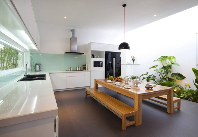 Thay vì các không gian được ngăn cách bằng bức tường dày cộp, bạn hãy thử loại bỏ chúng và thay thế bằng vách ngăn hở hoặc tấm ngăn kính để tạo không gian mở độc đáo. Giải pháp hợp lý thường được sử dụng cho không gian mở là vách ngăn kính ngăn cách giữa phòng ngủ và không gian phòng khách/ phòng bếp. Không gian bếp và phòng khách liên thông với nhau giúp gia tăng khoảng trống, tạo sự tiện nghi.